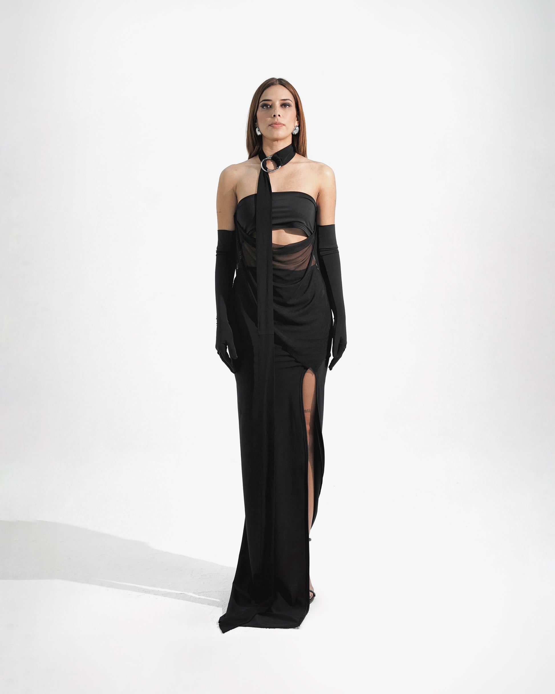 Top bandeau elástico con capa de mesh asimétrica drapeada.